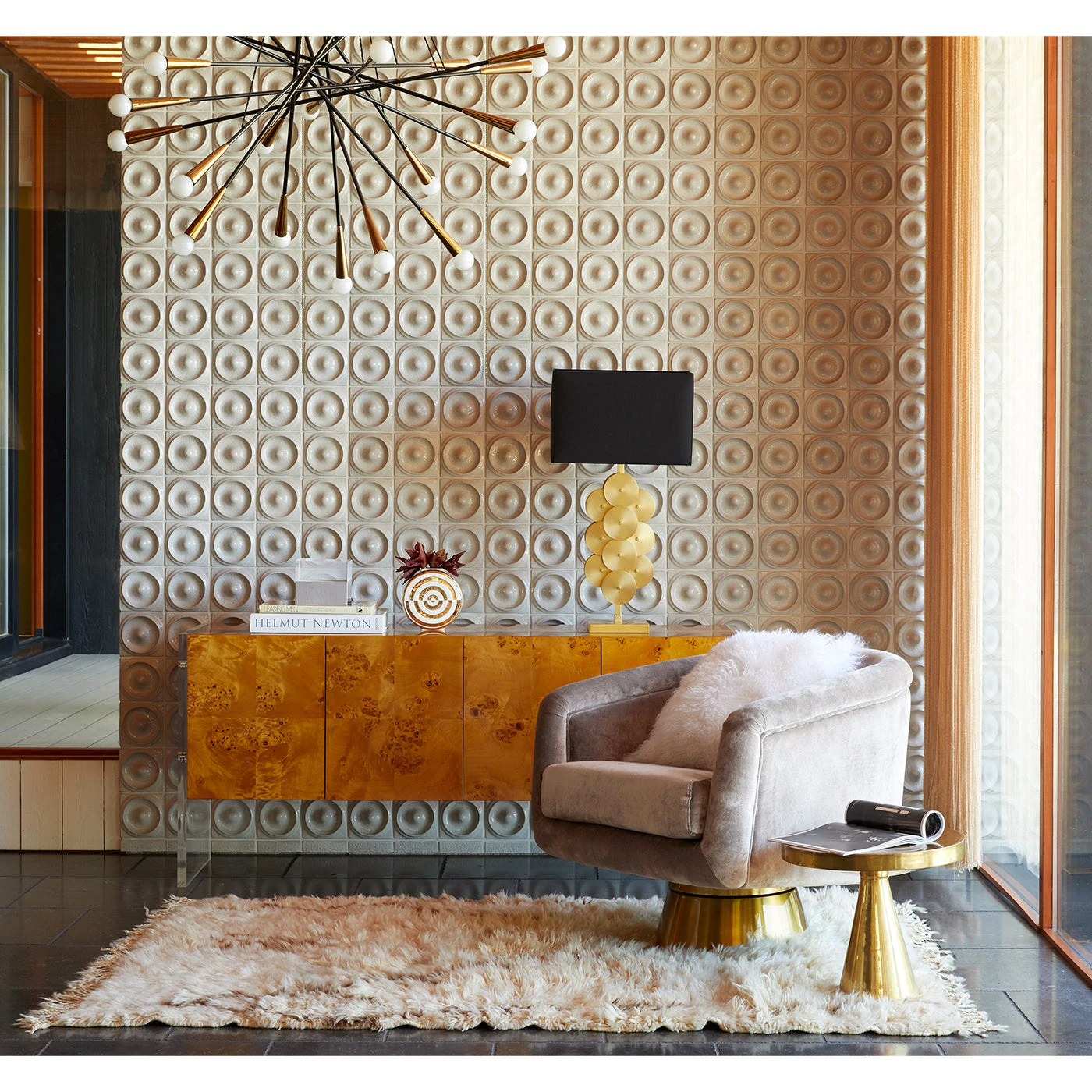 Think Halston, think Studio 54, think sybaritic style. But also think cozy, comfy swivel chair and a tuffet as cushy as it is chic. The perfect pair, available in dreamy Como Champagne velvet with brushed brass bases or in luxe Rialto Reef velvet with brushed stainless steel bases.