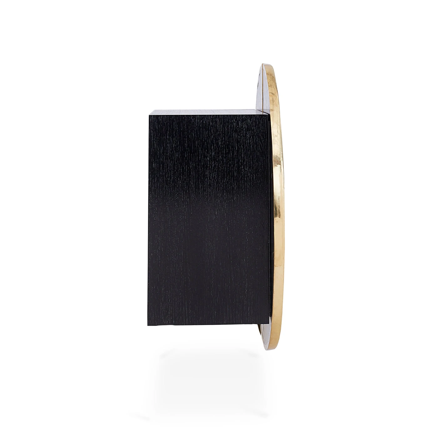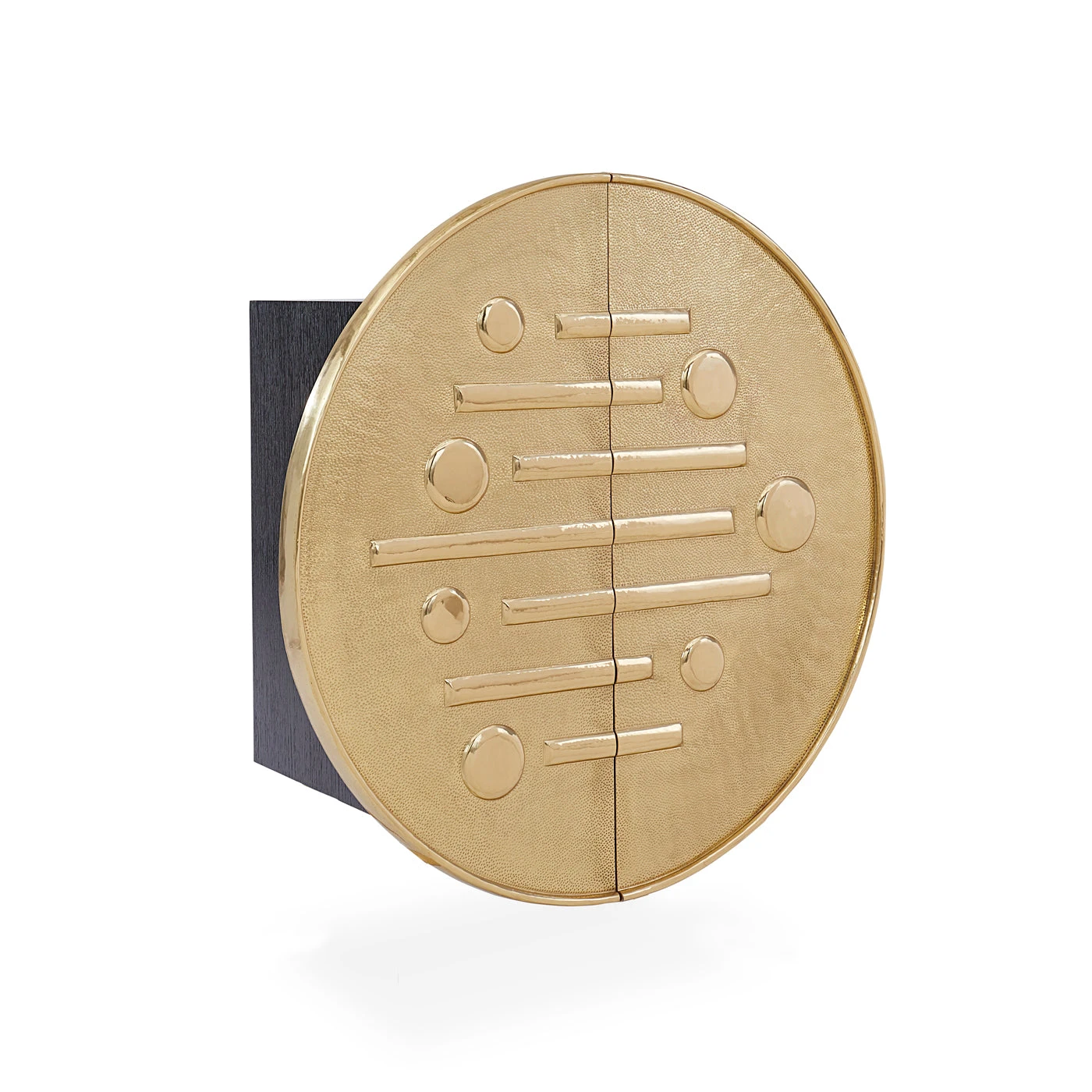 An ebonized and limed oak cabinet with doors featuring a relief texture originally sculpted in our Soho pottery studio—clad in a sheet of brass, then hand-hammered and polished to perfection. Designed to mount to the wall or stand on polished brass legs, our Reform Circle Bar is a must-have for couture cocktail hours. Interior features include adjustable shelves, a soft-close drawer and three organizational compartments.