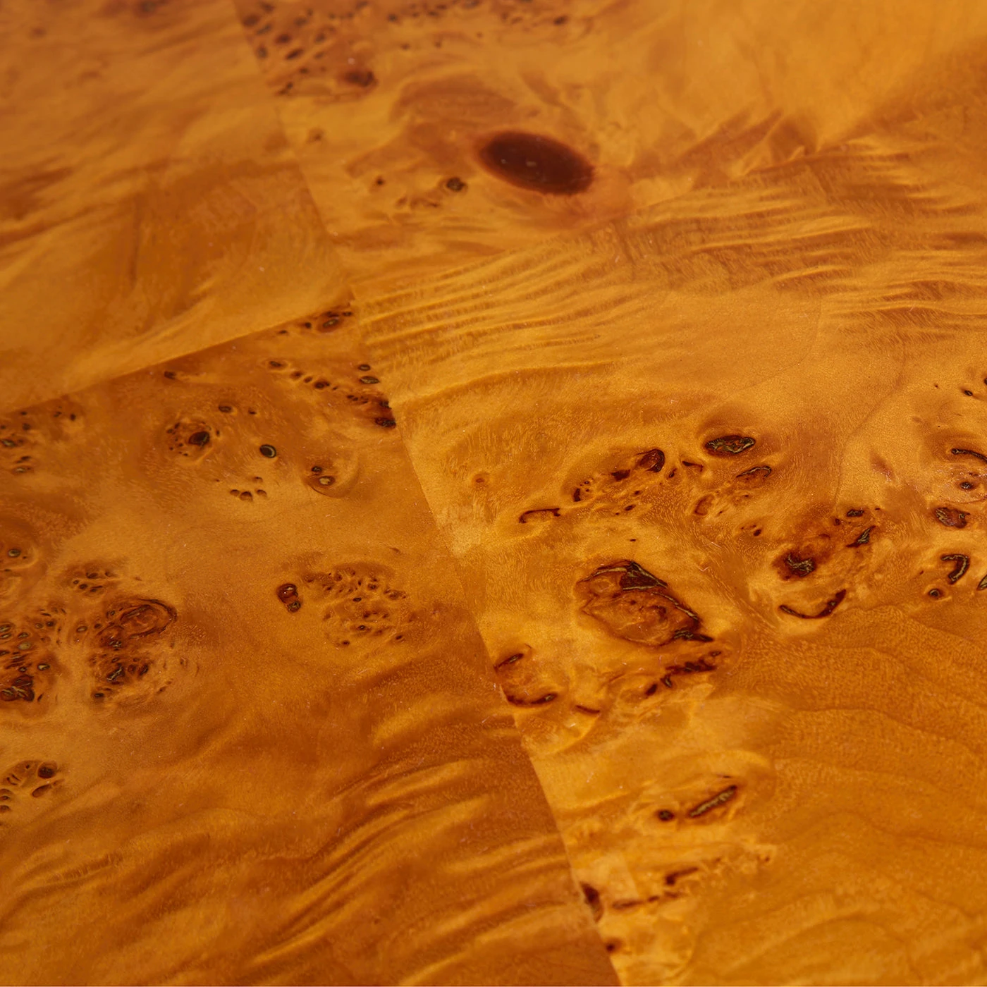 Architectural rigor meets the warmth of burled wood in our Bond collection. Finally—a minimalist dining table that feels organic, worldly, and wonderfully warm. Naturally honey-hued, pieced mappa wood is treated to a durable satin matte finish and set atop a polished nickel base featuring matte brass campaign corners. A removable 20″ leaf extends the table to comfortably seat up to 10. Perfect for a posh Park Avenue penthouse or a louche Tribeca loft.