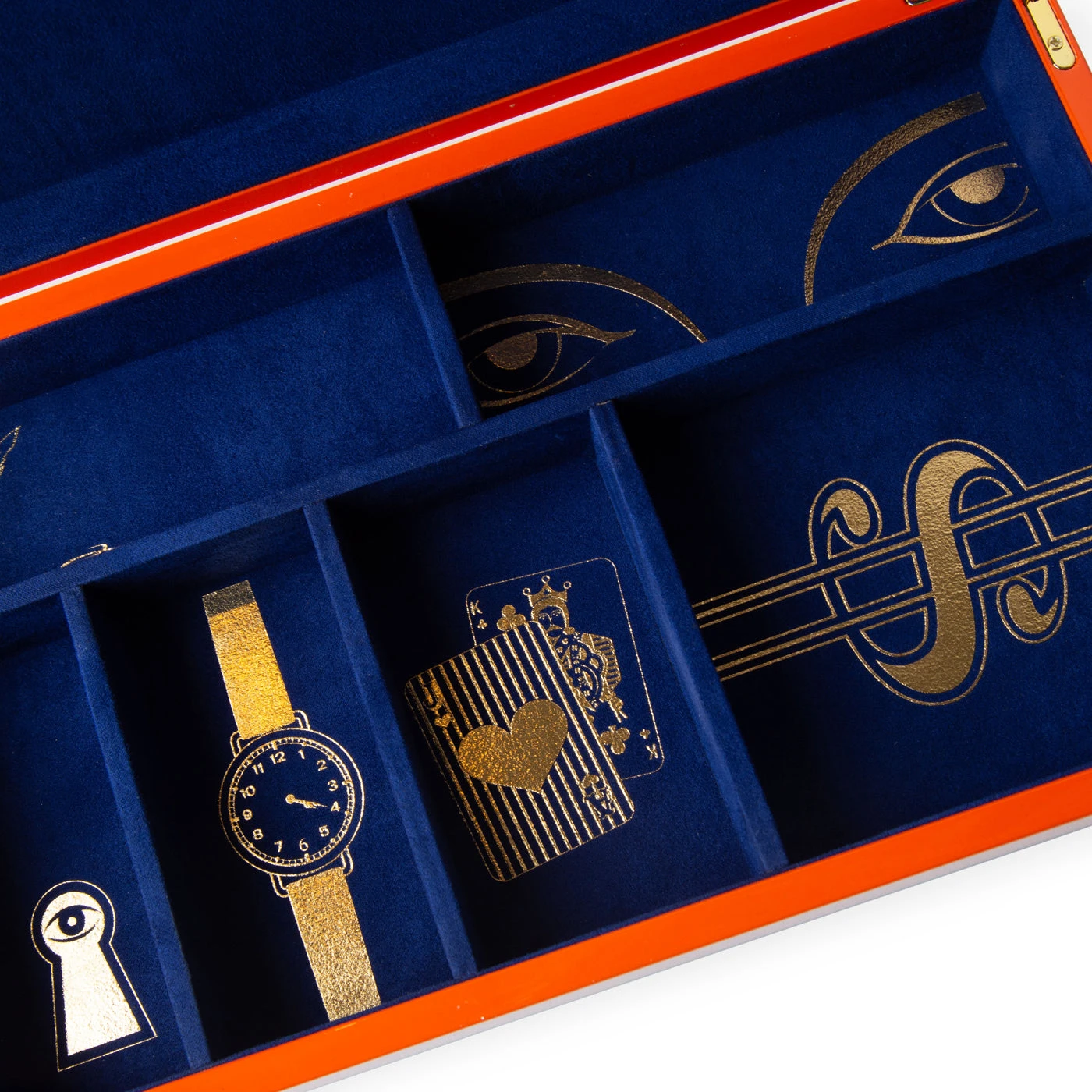 Featuring a bold orange finish trimmed in navy, our high-gloss Lacquer Valet Box keeps your everyday accessories stored in neat, navy velvet-lined compartments, each marked with our signature signs and symbols in glittering gold. An essential accent for anyone who likes to keep it chic and tidy.