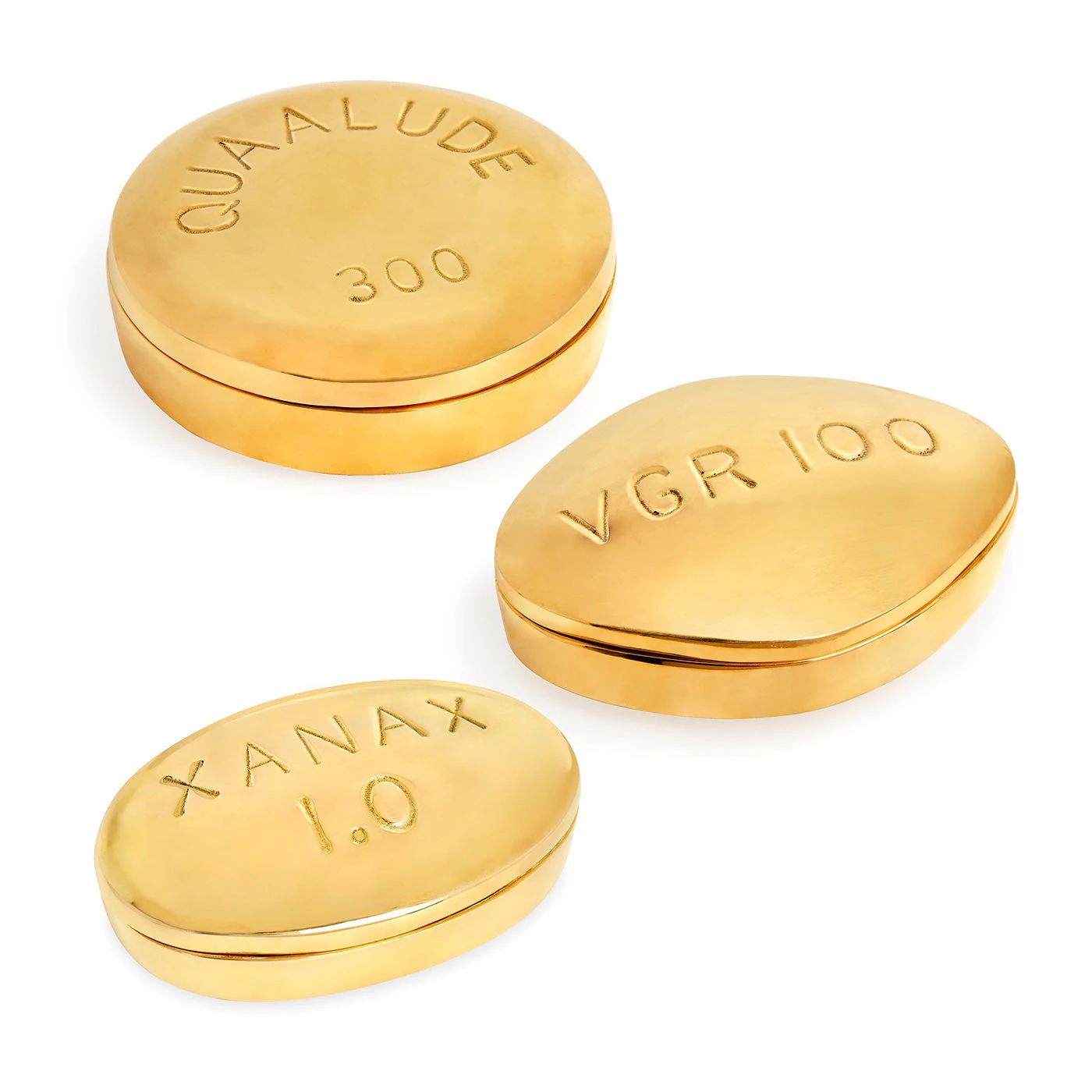 We’ve taken our longtime love of pharmaceuticals to a new level of luxe. Cast in solid brass, our hinged pill boxes are the perfect place to stash your stash. Each pill is laser-etched with its mg size so you can manage your dosage. The perfect provocative touch for your tablescape or hip hideaway on your bedside table.