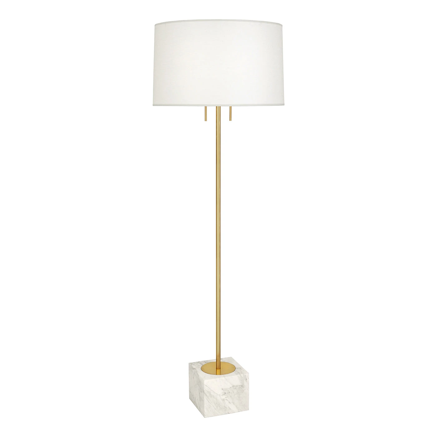 A generous cube of Carrara or Marquina marble supports a brass stem and fabric shade with dual brass pulls. Rigorously restrained, fabulously functional, unimpeachably stylish.