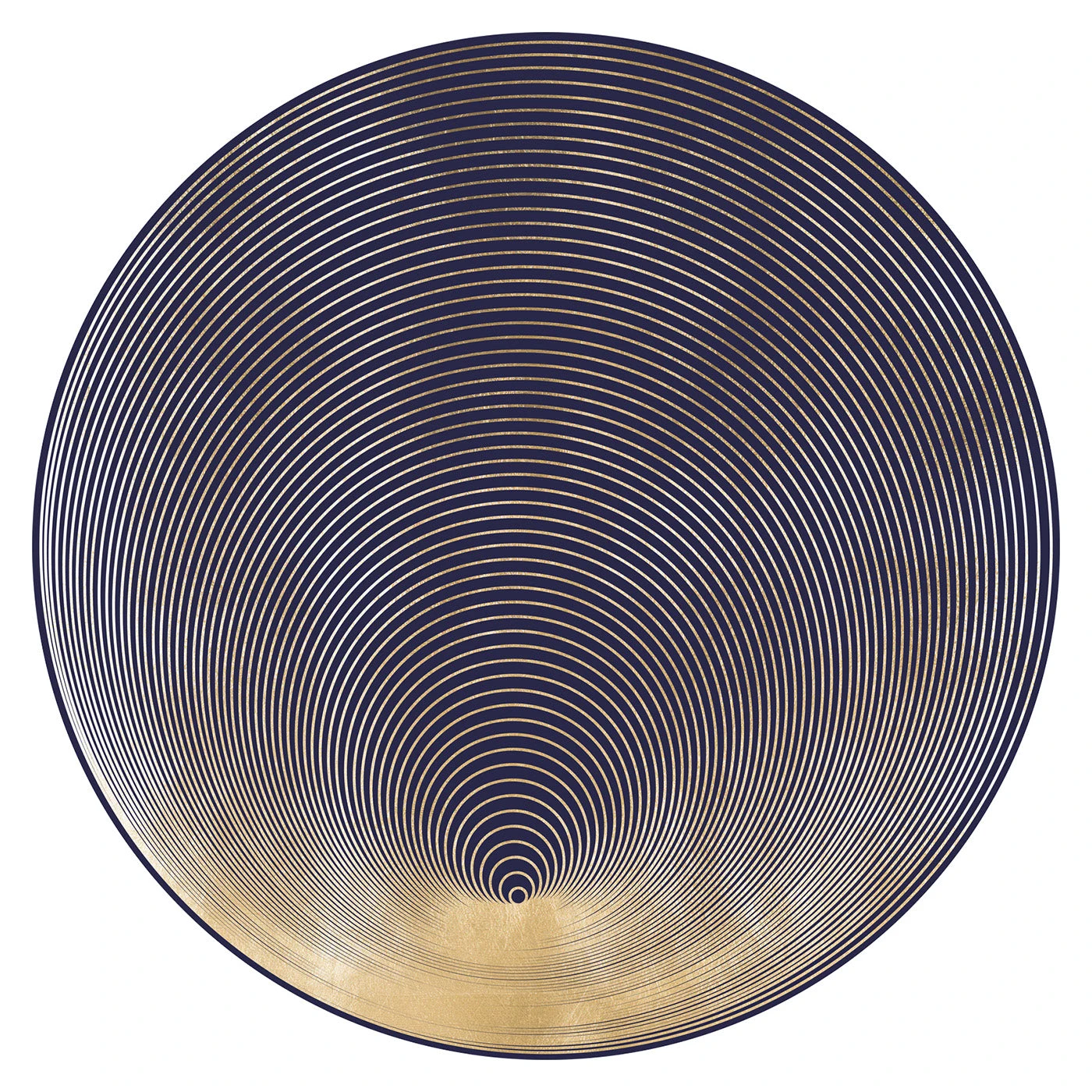 Using recent techniques, this design is printed on a gold aluminum with dark blue ink on top of many circles, creating a modern abstraction.
