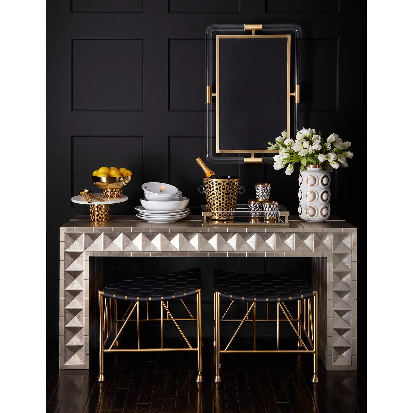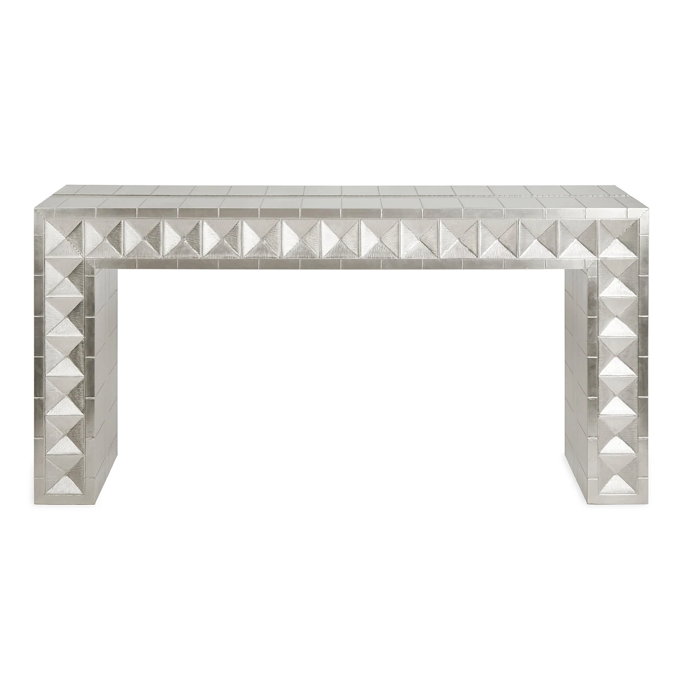 Our Talitha collection is crafted from nickel-plated metal with hand-stamped patterns applied to minimalist, modernist forms. Our waterfall console’s surface is reminiscent of silver leaf—it emits that same lustrous glow—but is wonderfully durable. Perfect for adding a regal, rich hippie vibe to your Park Avenue penthouse entryway or a bit of twinkly glamour behind a sofa in your downtown loft.