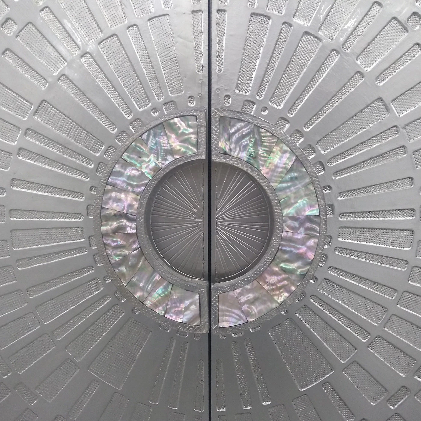 Our Talitha collection is crafted from nickel-plated metal with hand-stamped patterns applied to minimalist, modernist forms. The surface is reminiscent of silver leaf—it emits that same lustrous glow—but is wonderfully durable. Jewelry for your home, our armoire’s doors feature an organic, modern starburst pattern capped with pulls featuring a luminous, hand-cut abalone shell mosaic (due to the use of natural materials, colors will vary). Fitted with three drawers and two adjustable shelves, it’s a must for closet-challenged dwellings.
