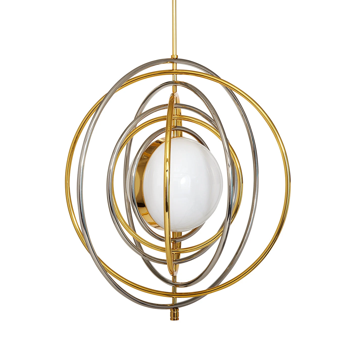 The perfect blend of minimalism and modernism. A glowing orb surrounded by Space Age-inspired rings of polished brass and nickel. The movable rings offer endless versatility: flatten the rings into concentric circles for a clean graphic vibe, or send them into orbit for a groovy-yet-oddly-traditional feel.
