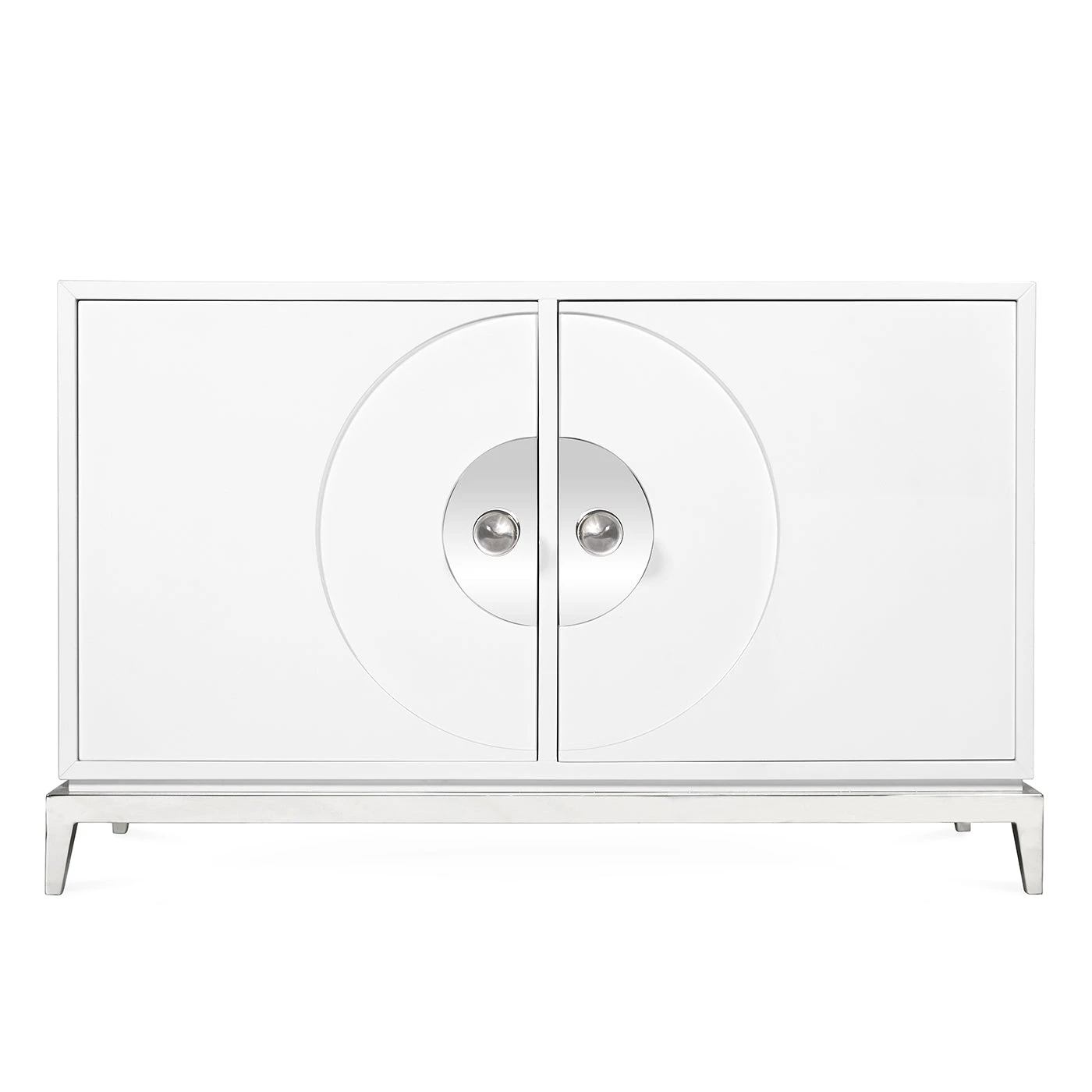 Neo-Classical lines, a dash of Hollywood glamour, and a top note of Mod moxie: that’s our Channing Collection. Our classic buffet is finished in glossy lacquer and features polished accents with oversized acrylic knobs. Demilune escutcheons on the doors add a dash of Chinoise chic to your dining room.