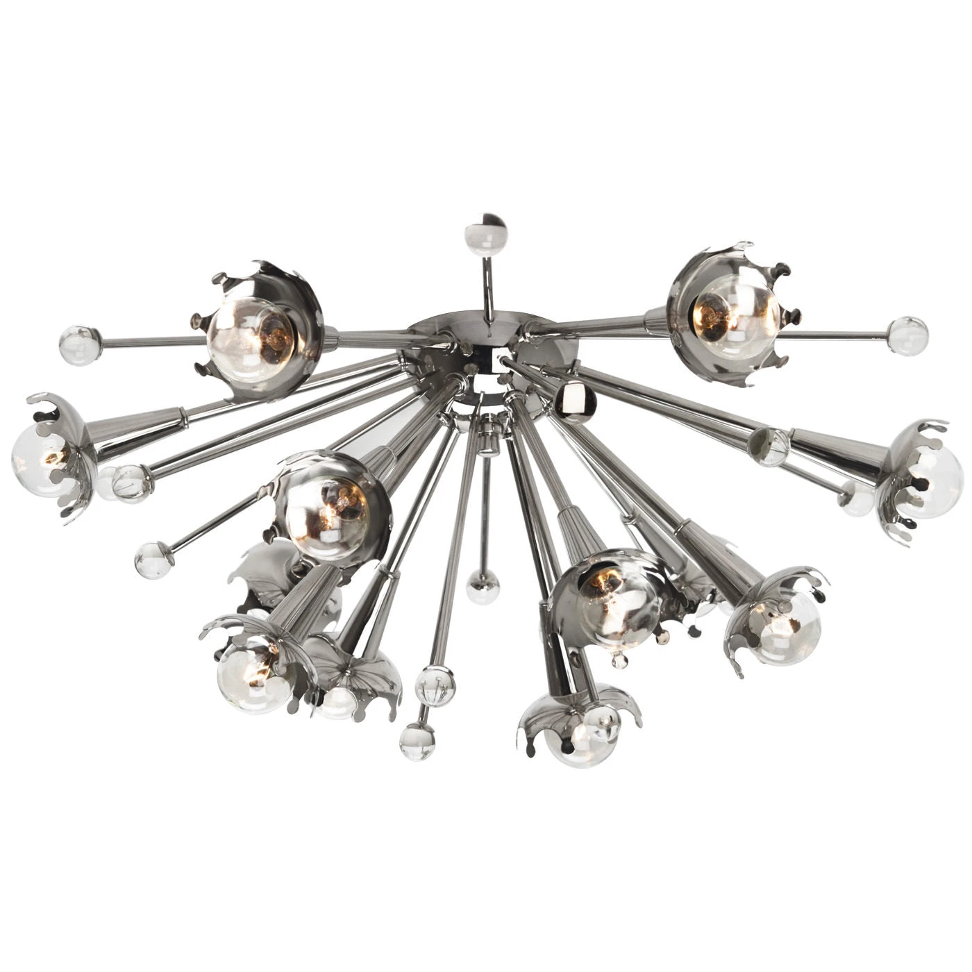 A groovy classic with our own twinkly twist. Plant a row of our Sputnik Flush Mounts over your bar for a chic and inviting loungey ambiance. Our riff on the design staple features custom laser-cut crown cups that halo the bulbs for a modern glow. Tiny stems with crystal accents further reflect the galactic light and lend a ladylike grace to any room. Available in antiqued brass or polished nickel.