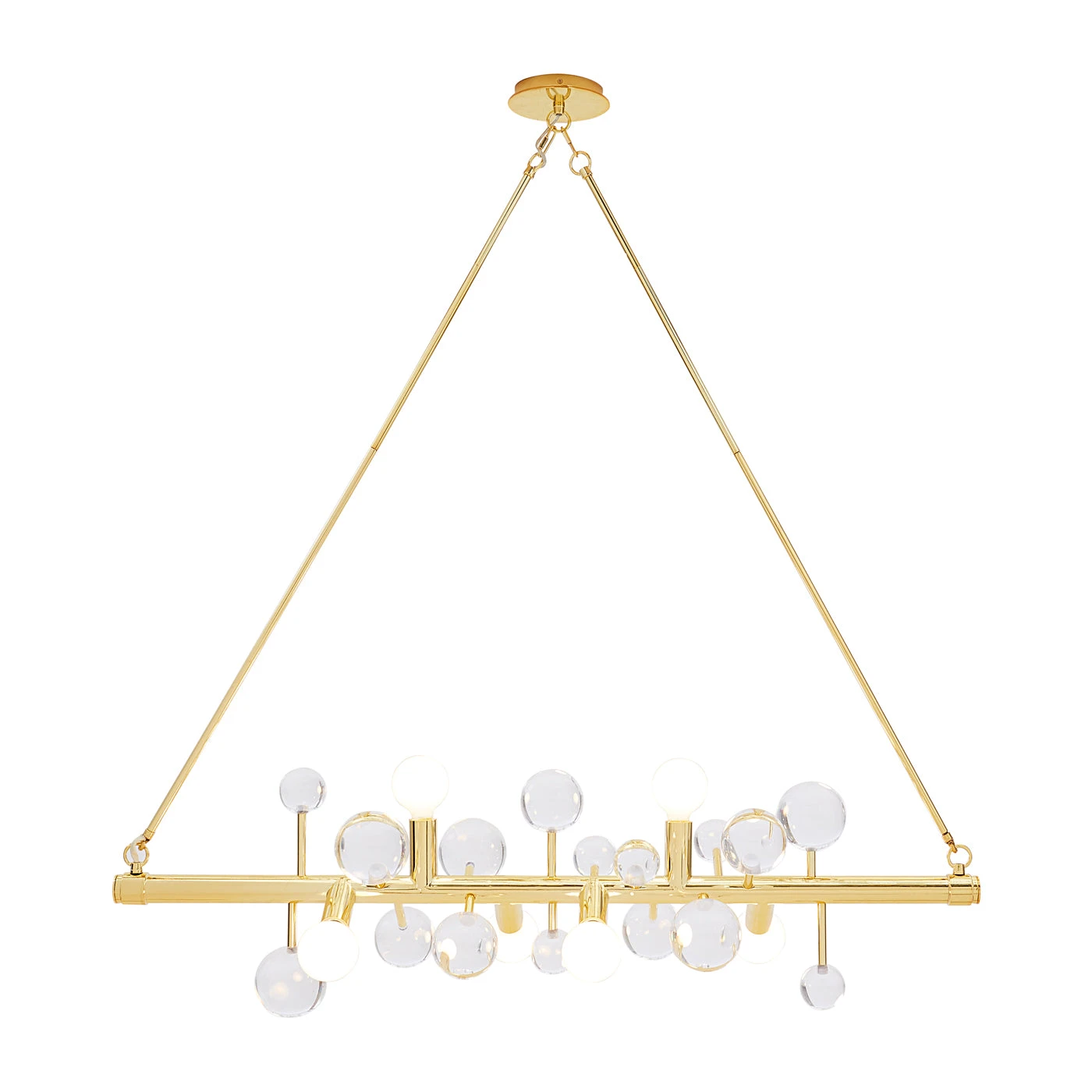 Float into our world of dreamy orbs and cabochons. A dazzling line of light suspended from two brass rods, our Globo Six-Light Linear Chandelier features a polished brass bar dotted with jewel-toned acrylic spheres and globe bulbs. Jewelry to swag above your dining table, it’s a little industrial, a little fancy, and a lot glamorous.