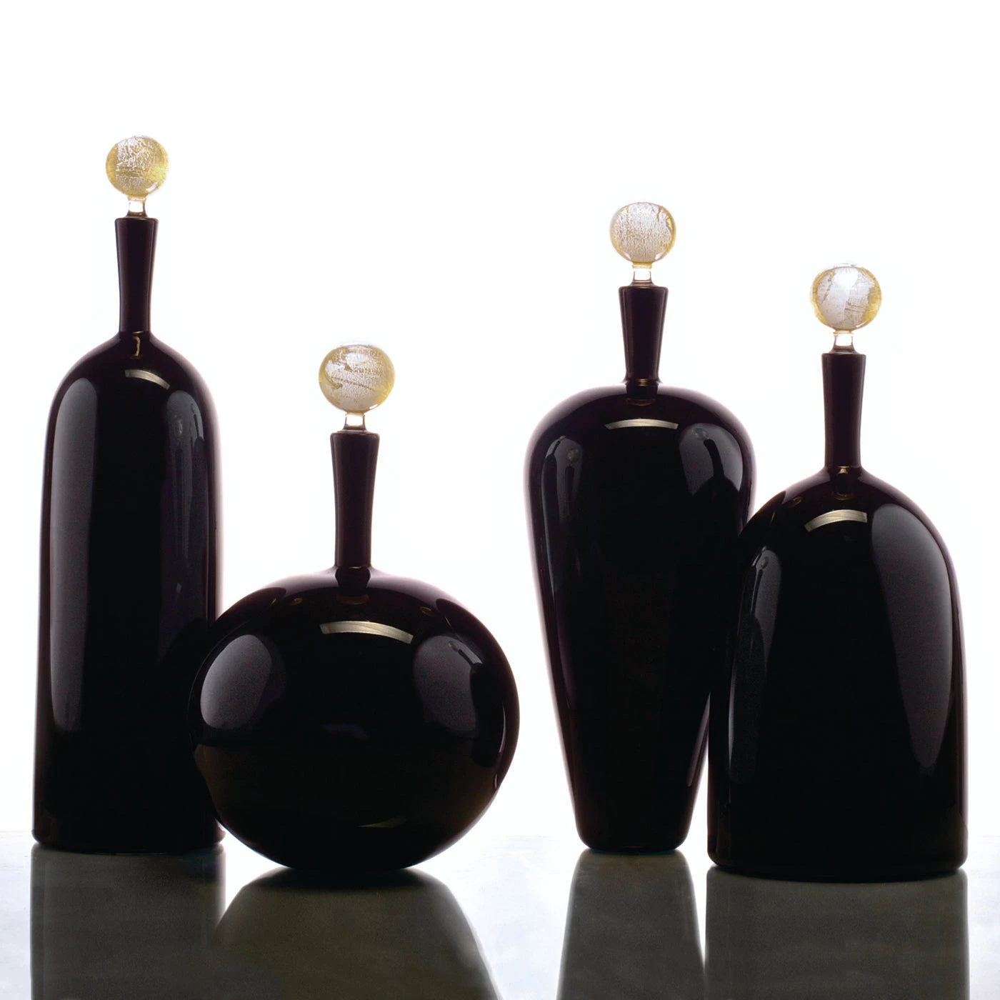 Using the “free blown” glassblowing technique that uses human hands, not molds, each Joe Cariati decanter is made by hand and saturated in color.