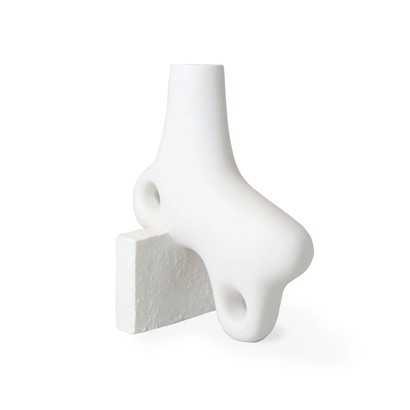 Functional sculptures featuring smooth organic forms intersecting with rough-textured blocks of porcelain. The perfect place for colorful buds to pop, they also make a strong statement without.
