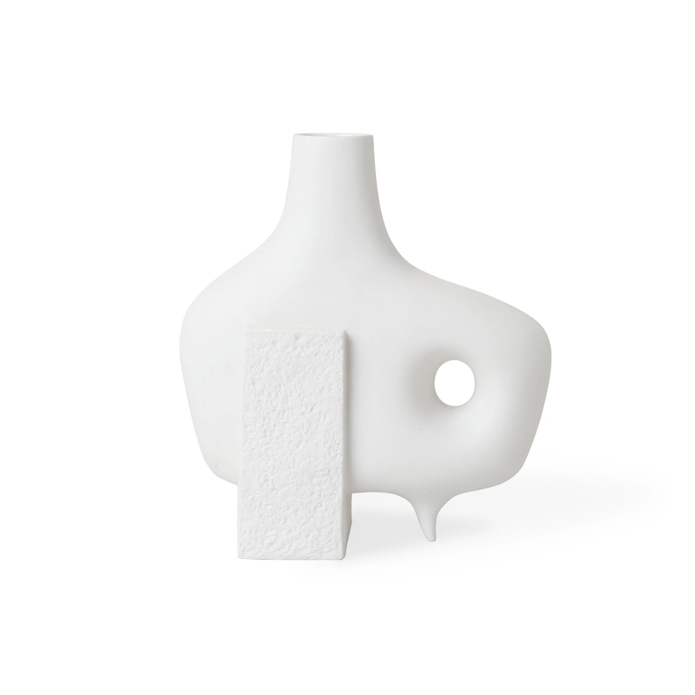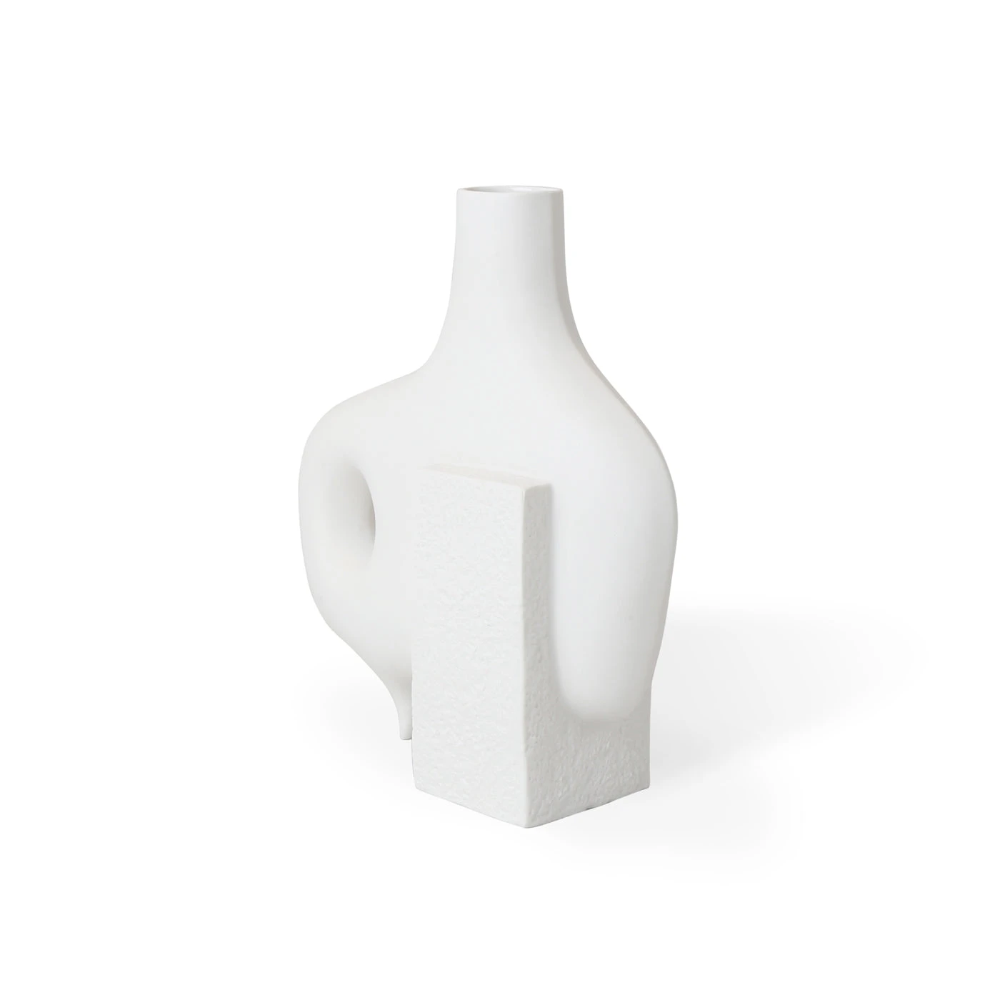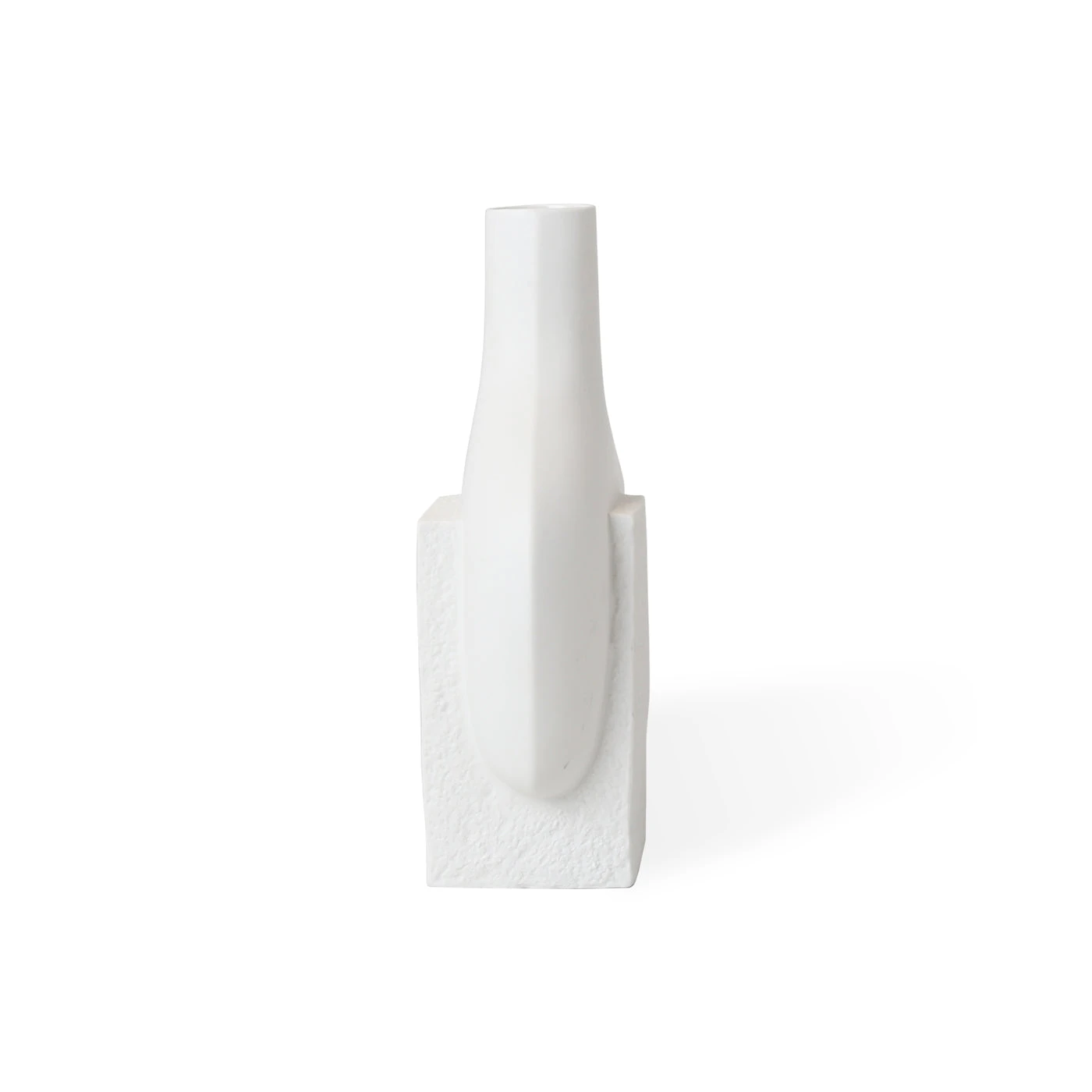 Functional sculptures featuring smooth organic forms intersecting with rough-textured blocks of porcelain. The perfect place for colorful buds to pop, they also make a strong statement without.