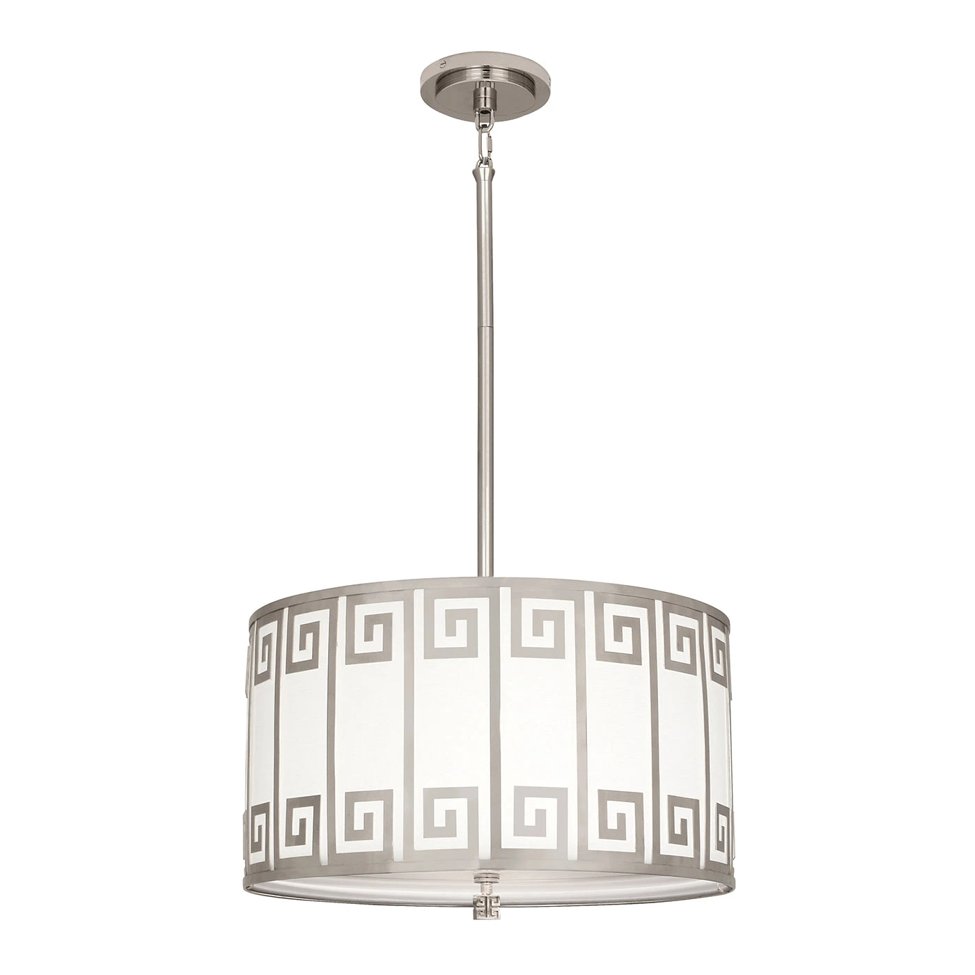 An abstracted nod to the Greek Key, our Mykonos Pendant is an updated take on the classic style. In polished brass or nickel, our signature dual key shape rings all the way around a white shade—the perfect pick for a preppy Palm Beach moment.
