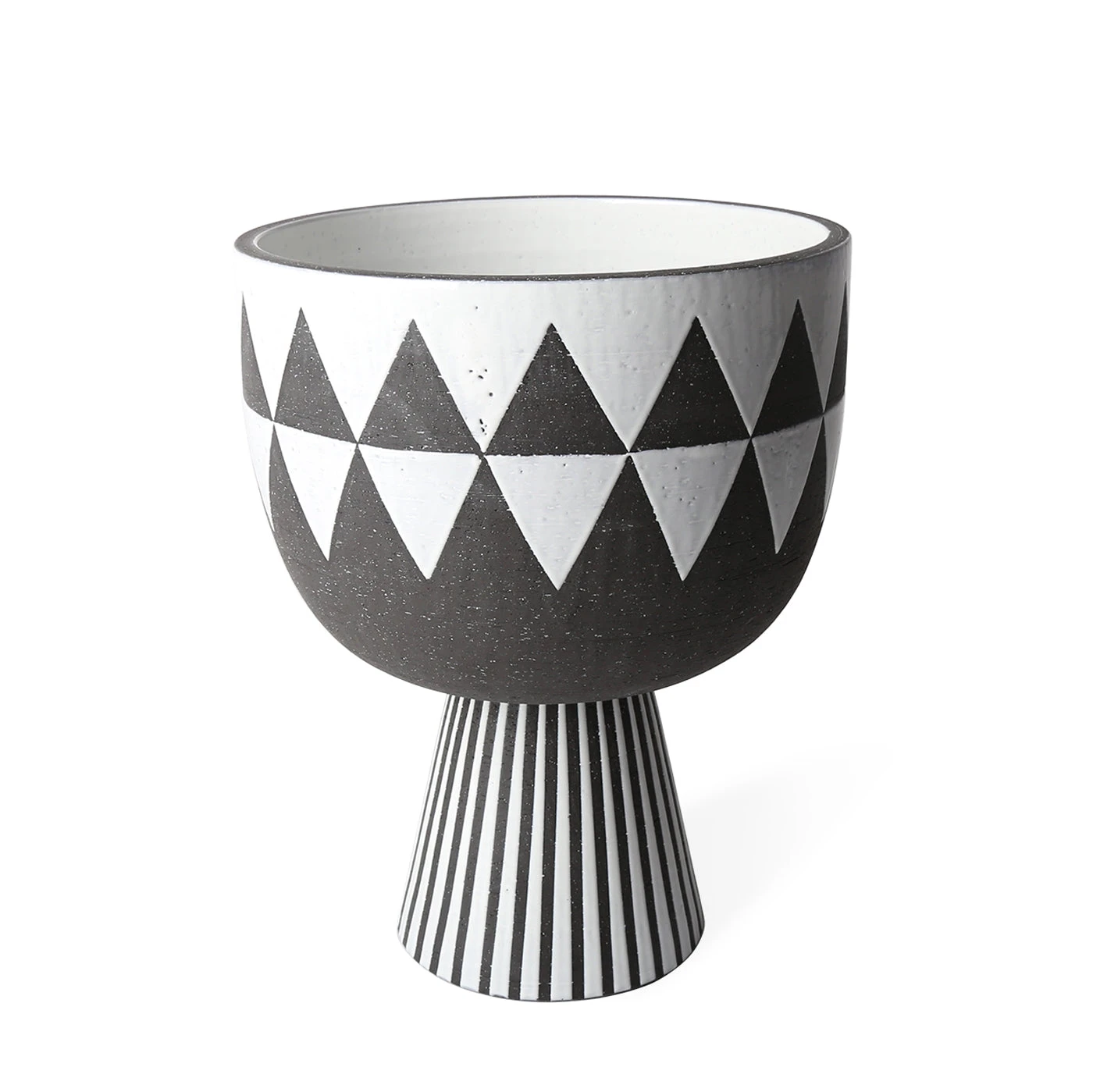 Crafty yet couture, graphic yet organic—our Palm Springs vases bear the marks of rigorous craftsmanship: Hand-thrown by skilled artisans in our Peruvian workshop, each vessel starts with black stoneware infused with chunky grog and trimmed and chattered* to create a striated texture. Linear graphic patterns are hand applied using tape and wax resist and finished with a satin-matte ivory glaze.