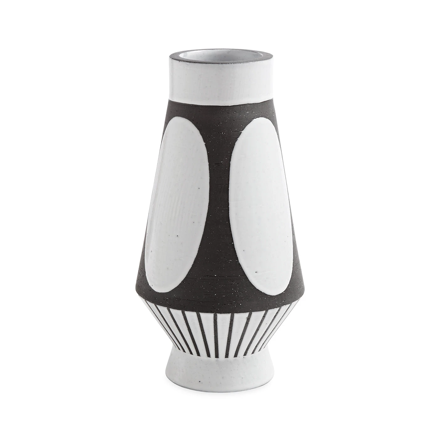 Thrown from black stoneware infused with chunky grog and trimmed and chattered* to create a striated texture. Patterns are masked off using tape and wax resist and finished with a satin-matte ivory glaze. Why not cluster three on a mantle or a bookshelf to create an haute hippie skyline?
