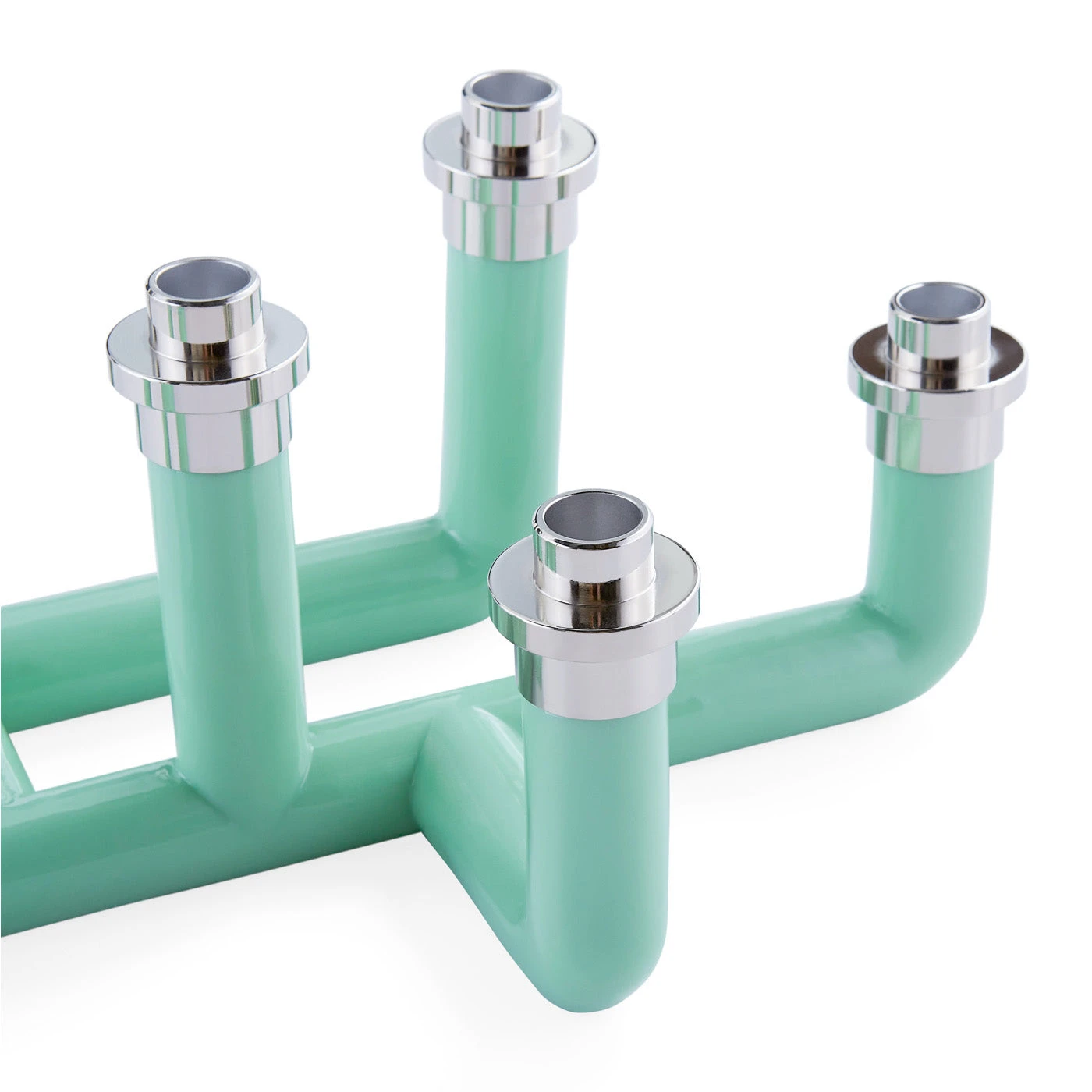 70s inspired patterns meet daring dimension. Our Pompidou Candelabra features solid acrylic pipes of staggered heights fused together and accented with shiny nickel caps. The mood-setting centerpiece your modernist table needs. In luxe clear or posh celadon acrylic.