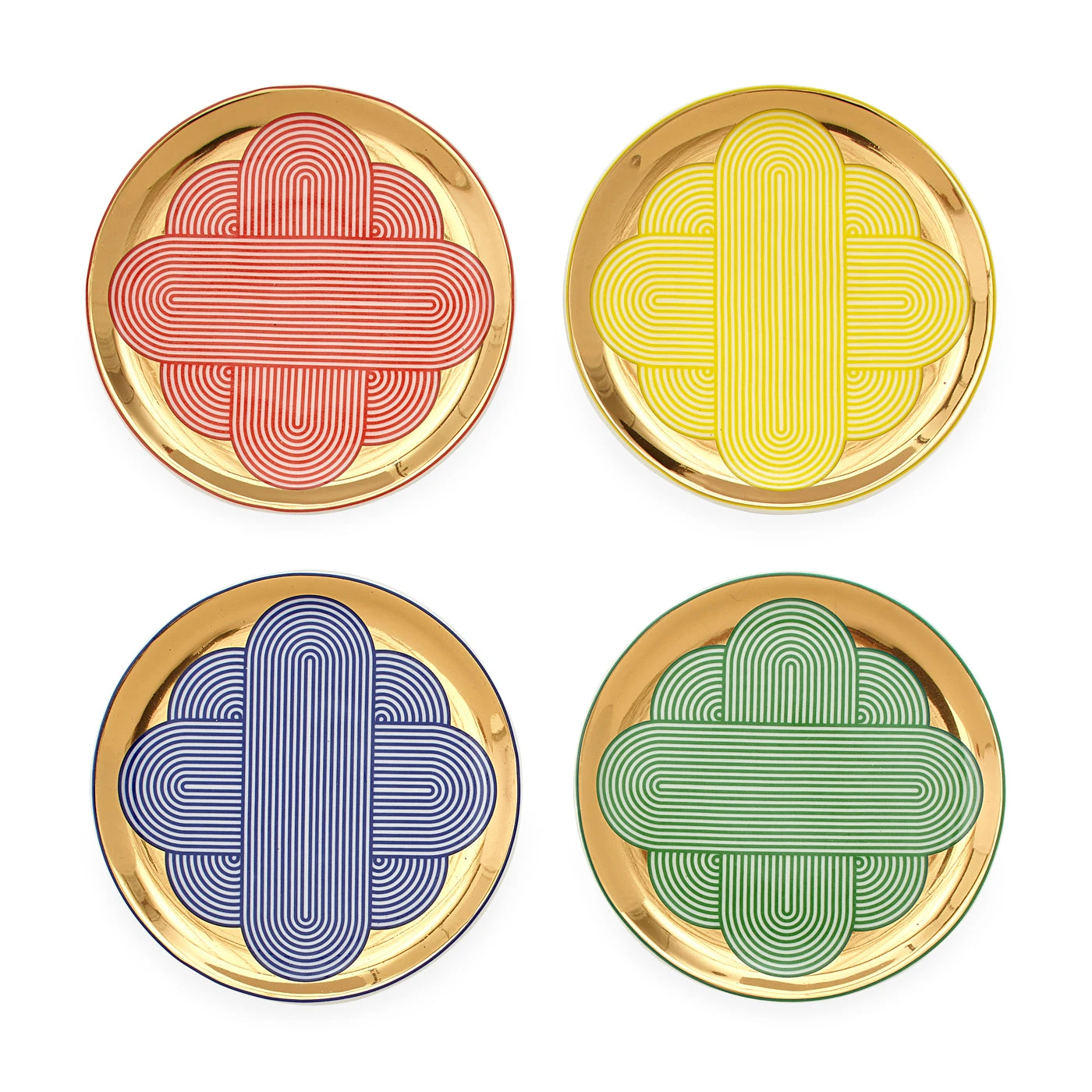 Pairing 70s-inspired patterns with bold primary color, our Pompidou Coasters are just the toast-worthy power-pop your cocktail hour deserves. Crafted from high-fired porcelain with gleaming gold backgrounds that add another dimension.