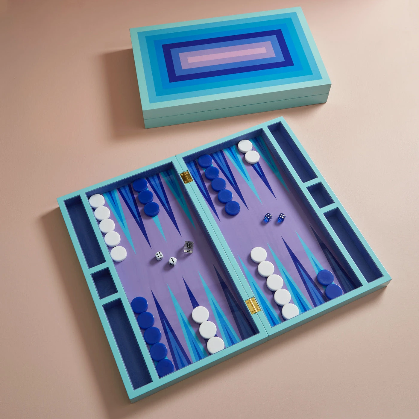 Crafted in couture lacquer and featuring 60s inspired concentric squares in cool blues and shades of lavender, our Scala Backgammon Set is the mod moment your game night needs. After vanquishing your foes, fold it closed for a cool cocktail table accent.