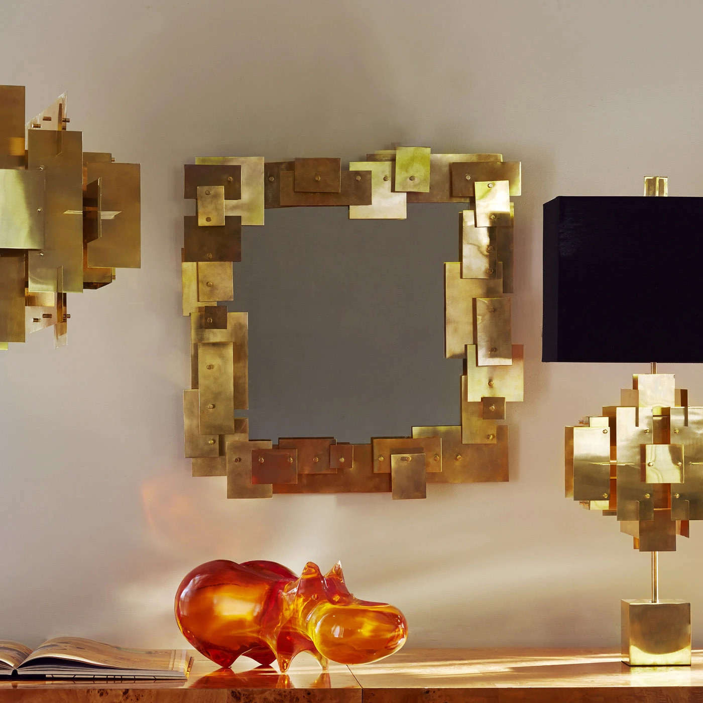 Inspired by a house of cards, our Puzzle Table Lamp is made of sheets of solid brass layered in a dynamic composition and is topped with a moody matte black shade. The architectural modernist feel is warmed up by the luminous metal. Greet your guests with a pair on your foyer console.