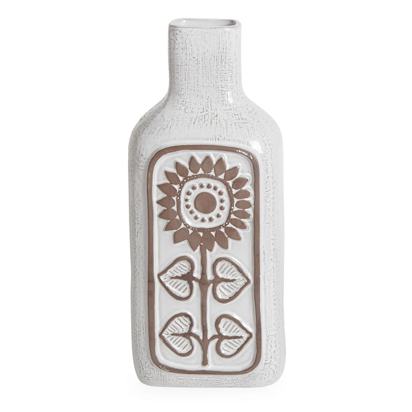 Our warm and welcoming stoneware vessels feature melted ground glass in sparkling orange, blue and mossy tones cooled to a crackled finish. Spin to reveal a simple brown and white motif on the reverse. One adds a touch of couture craft to your console, or group the collection to give your mantel some mid-century magic.