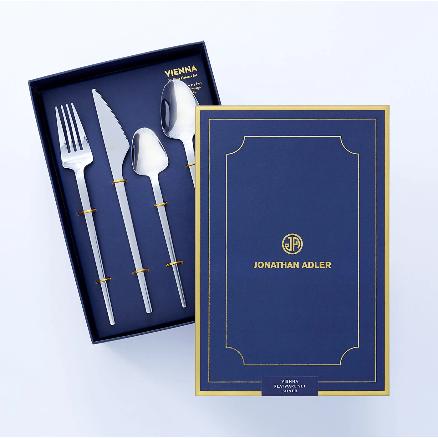 Just the twinkle your table setting calls for, our fabulous Vienna flatware is available in brushed gold tone or polished silver tone. Elegant and sculptural at once, each set includes six four-piece place settings. Chicly packaged for storage or gifting.