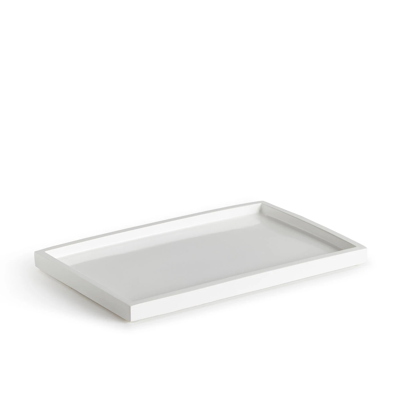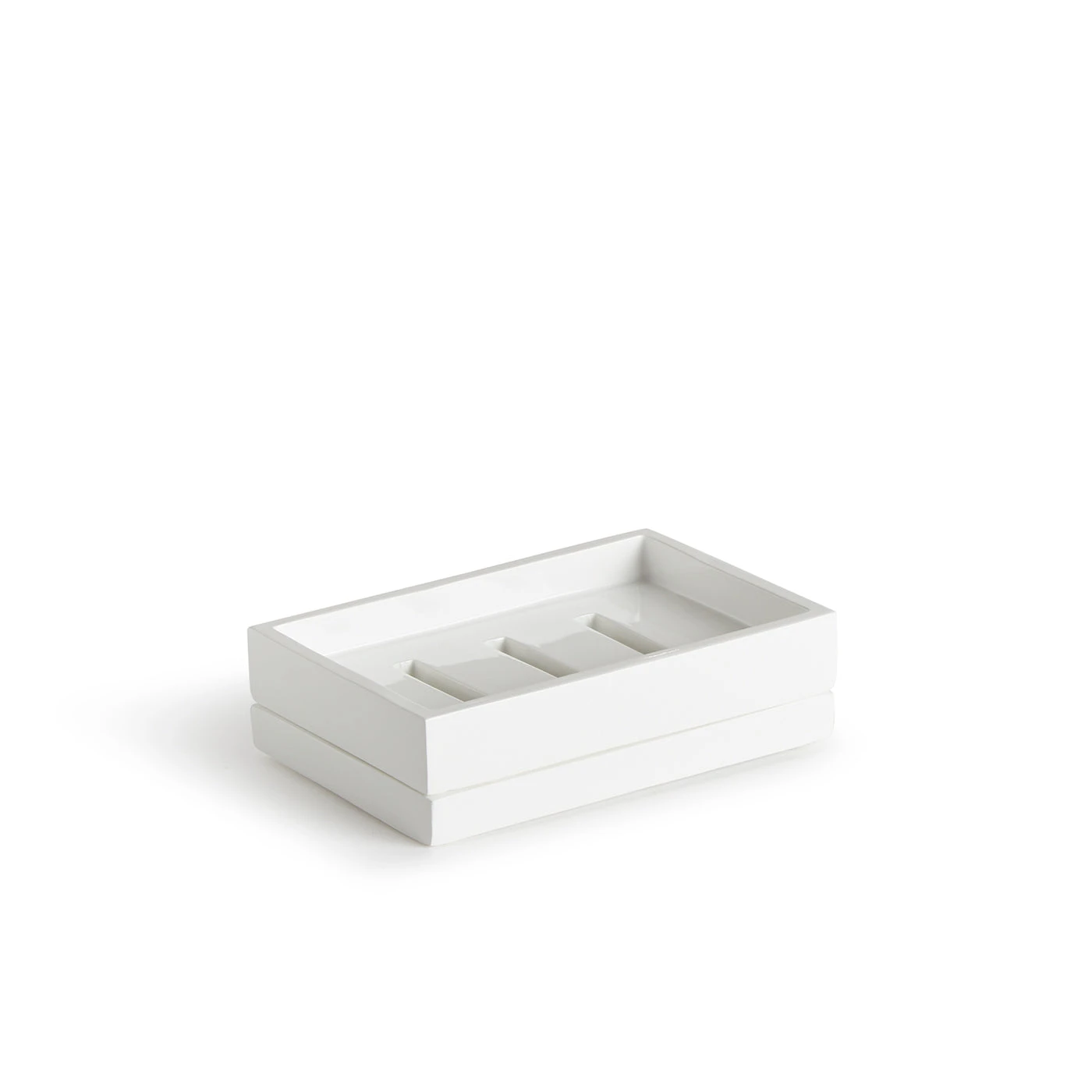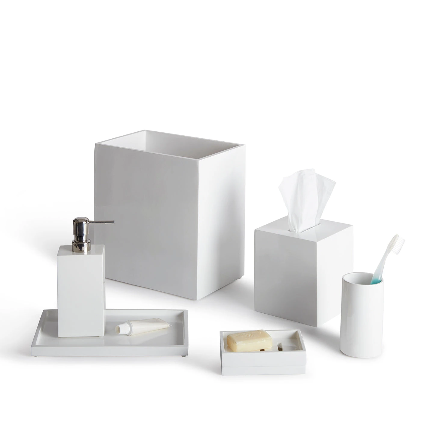 Our White Lacquer Bath Set includes one wastebasket, one tissue box, one soap dispenser, one tumblr, one bath tray, and one soap dish.
